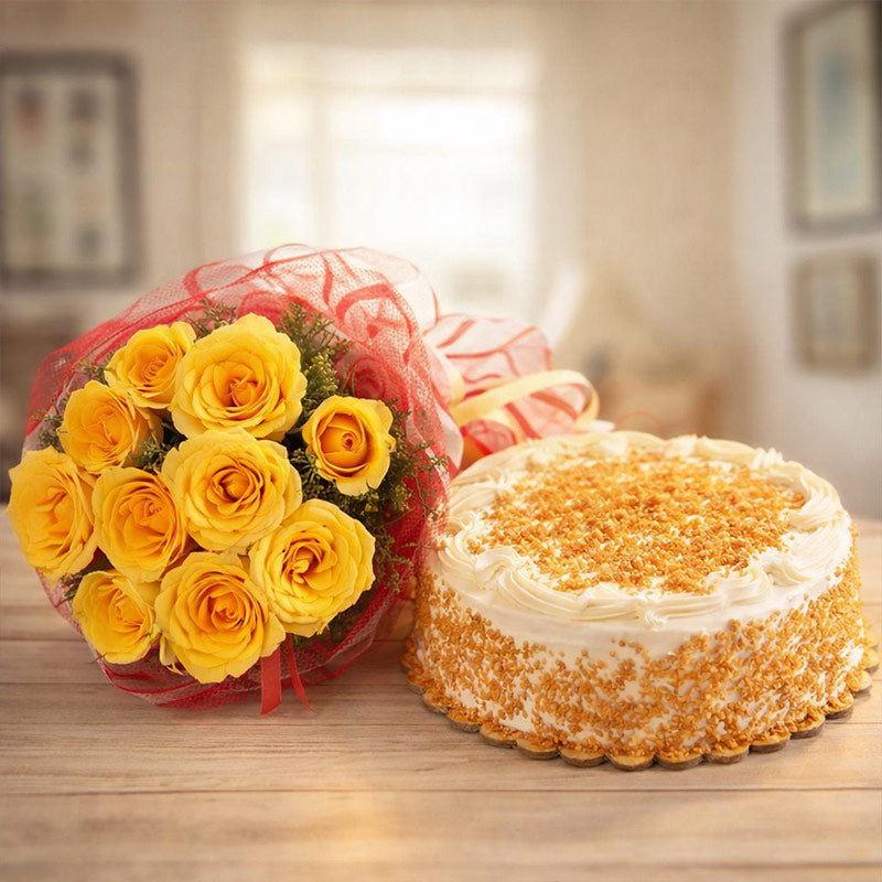 Spread some warm sunshine in the lives of your near and dear ones with this bright hamper of yellow flowers and a yummy cake. ‘BRIGHT N BUTTERY’ makes for a complete gift and it contains a bunch of fresh and bright ten pieces of gorgeous yellow roses that comes with a delectable half kg butterscotch cake. Send flowers and cake online to your loved ones as you surprise them with this stunning hamper that makes for a pretty picture. Apart from special occasions, this can be gifted to a dear one who is depressed regarding a certain matter. Spread cheer, happiness and sunshine in the lives of your dear friends and family as you surprise them with this lovely gift that makes for an exceptional choice.
