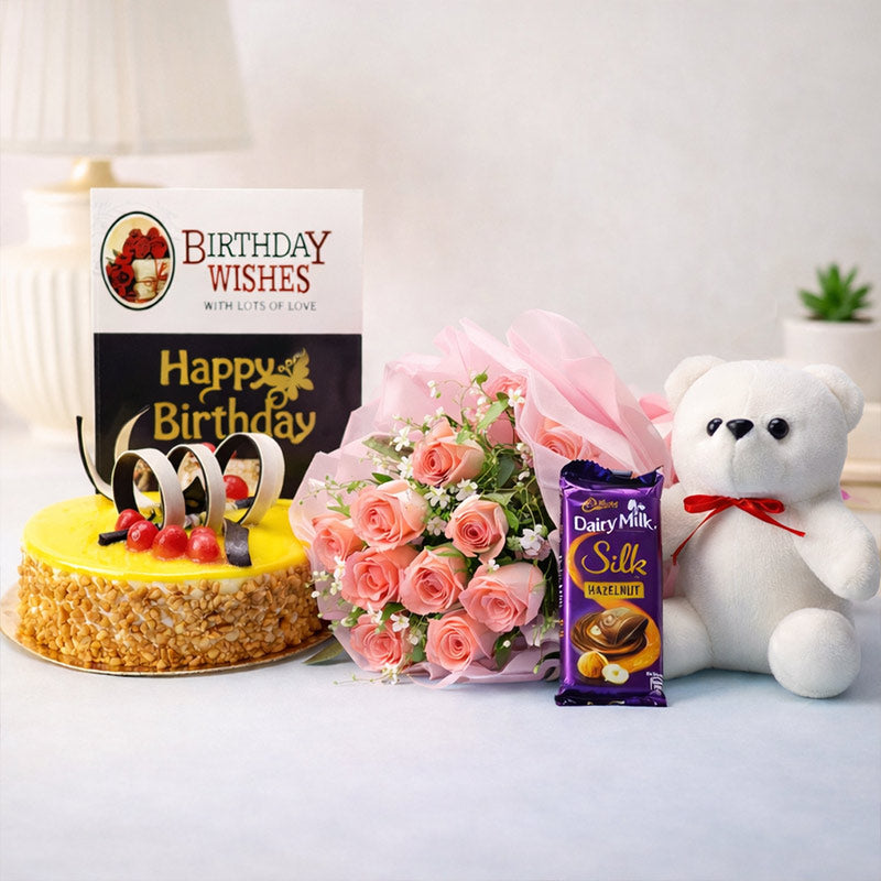 Be it birthdays, anniversaries, or occasions when you need to convey congratulatory greetings, or any other special occasion or purpose, here’s the perfect hamper to pamper your loved ones in India. ‘Enigmatic Blend’ features a half kg delicious butterscotch cake that has been baked with the best of ingredients, a bunch of pretty pink roses that are neatly done in a bunch with fillers, 2 Dairy Milk chocolates, 1 Silk chocolate, a cute and cuddly teddy bear along with an occasional greeting card. Avail online gift delivery to get this brilliant hamper delivered to every nook and corner of the country in a hassle-free manner. Come, place your order online right away with us!